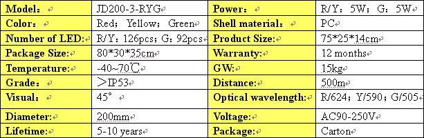 JD200-3-RYG three unit screenful combination LED traffic lights,ultra-high brightness light-emitting diode chips AlInGaP and InGaN as a product of light, low power consumption, long life, maintaining a reasonable cost of the product.