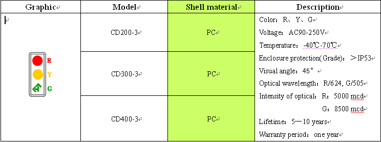 CD300-3 LED Lane traffic lights, generally used in toll stations, tunnels, ports, parking lot and other traffic road lights, With high efficiency, long life; high temperature resistant, resistance to vibration, low power consumption, moisture, dust Etc. features.